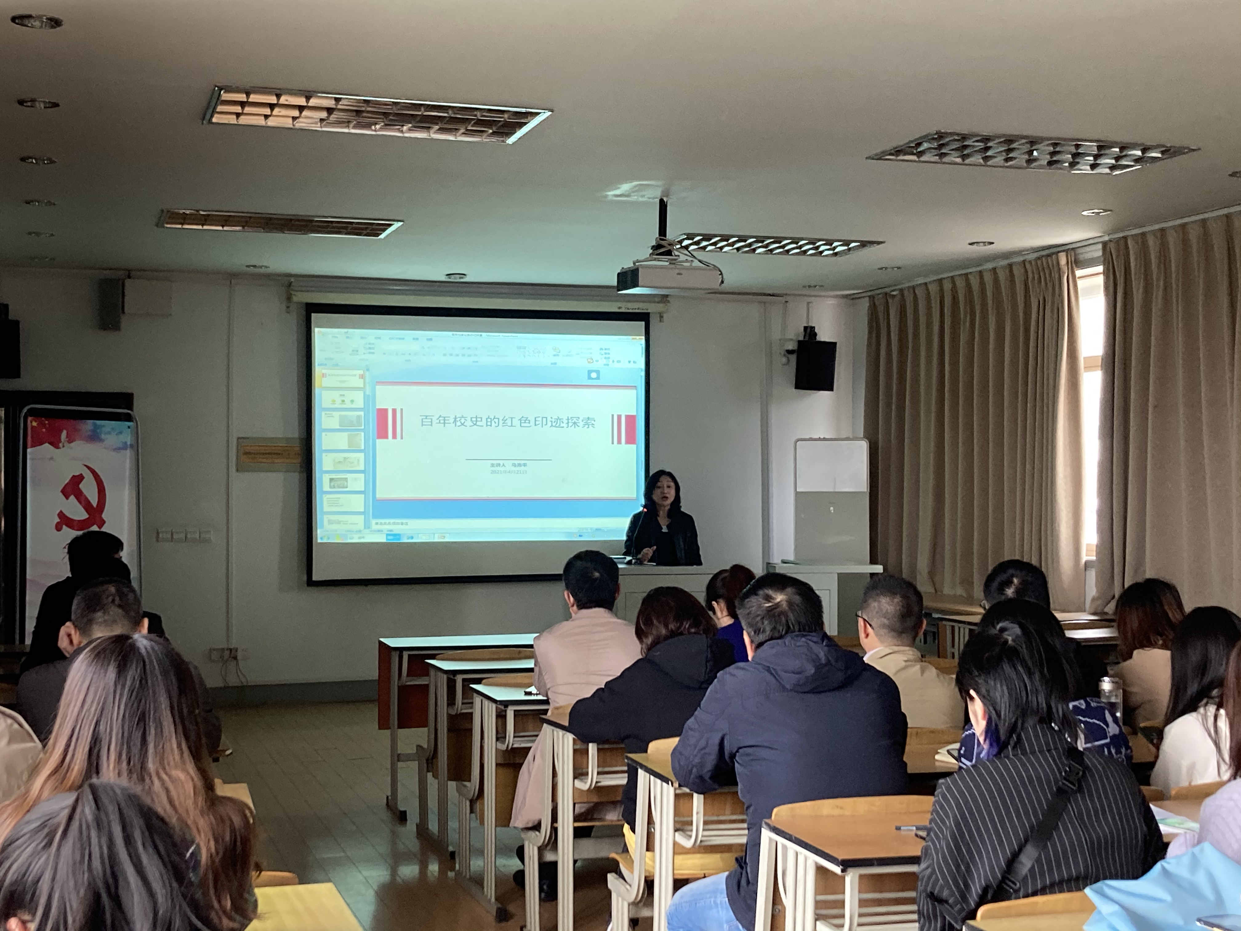 马海平老师以《上海美专红色校史探寻》为主题,从三部分讲述了“百年校史红色印迹”。首先介绍了许多上海美专党员员工包括韩乐然、傅风君、祁修文、姜运开、彭友贤、陈锦章、吴印咸等,其中韩乐然,他被人们称为“中国的毕加索”,1923年加入中国共产党,成为中国共产党内最早的朝鲜族党员,也是东北早期建党领导人之一。他把传统文化与艺术相结合,把绘画与考古融为一体,创作了大量摄影、绘画作品,为我们留下了许多宝贵的文化遗产。随后,马老师讲解了上海美专师生在抗日战争、解放战争中成立上海美专国难宣传团,通过漫画的形式,抵制日货,宣扬国货,做反战歌曲,唤醒人们抗战意识的觉醒等作出的贡献。最后,马老师指出上海美专的师生被称为民主运动的堡垒,在民主运动中用绘画、木刻、音乐的形式传播思想,在宣传方面起到了重要的作用。同时,上海美专百年校史中红色印迹对后世的艺术创作产生了深远的影响。