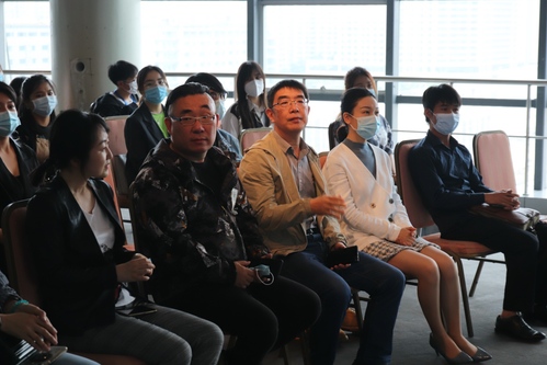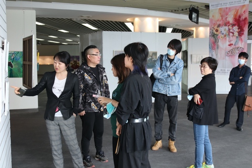 展览开幕式主持人,本次展览公关传播组姚嘉芸同学宣布展览正式开幕,开幕仪式结束后,担当本次展览艺术指导的陆霄虹老师、“策展人”角色的丁行健同学、“执行策展人”角色的陈科帆同学一同在展览现场与线上直播间为观众导览。