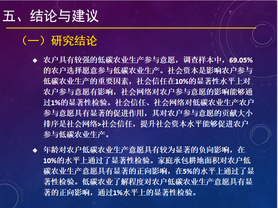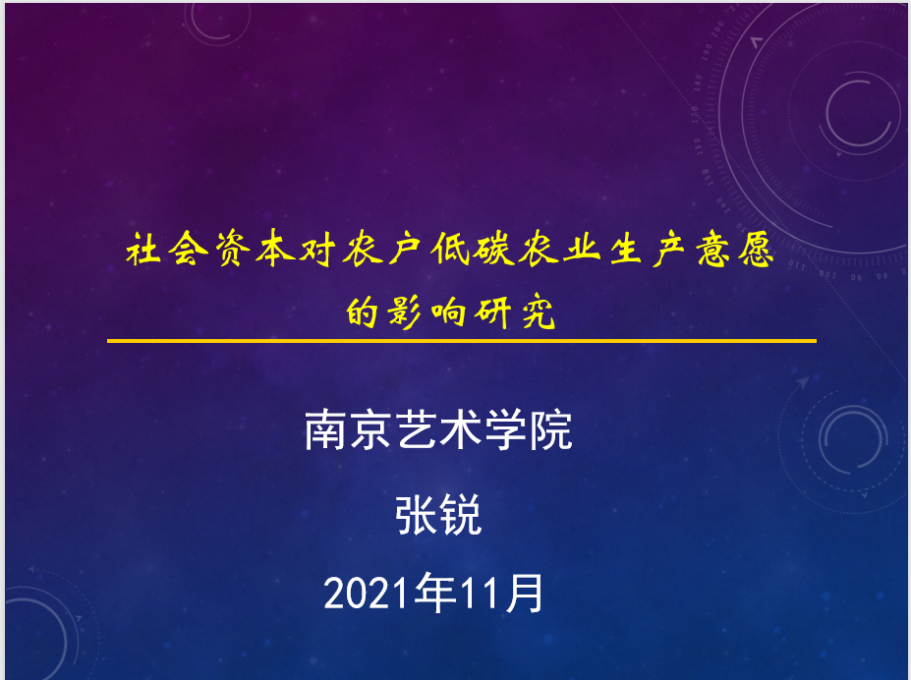 张锐老师首先介绍了低碳农业生产的研究背景,低碳农业是应对全球气候变化农业生产方式的变革,它是一种既有利于环境保护,又有利于提高农产品数量与保障质量安全的现代农业发展形态,发展低碳农业是乡村产业振兴的重要内容,也是深入推进乡村振兴战略的重要举措。农户作为农业生产微观经营主体,其生产方式的低碳化是农业“低碳化”发展战略的关键。其次,运用Logistic模型对江苏省的农户调查数据进行了分析,主要从社会资本、农户个人特征、家庭特征、认知特征几个方面对农户低碳农业生产意愿的影响因素行进分析。研究结果表明农户低碳农业生产意愿较高,69.05%的受访农户表示愿意参与低碳农业生产。社会资本是影响农户参与低碳农业生产的重要因素,社会信任、社会网络对农户低碳农业生产意愿具有显著的促进作用,其对农户参与意愿的贡献大小排序是社会网络>社会信任。控制变量中,低碳农业了解程度、家庭承包耕地面积对农户低碳农业生产意愿具有显著的正向影响,年龄具有负向影响。因此在低碳农业发展的过程中,应进一步提高农户社会信任、丰富社会网络、培育社会规范,提升农户社会资本水平;加强教育培训,提高农户低碳农业了解程度,增强农户低碳农业生产意愿。