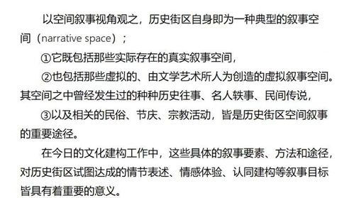 首先,王智洋老师从对近年来中国历史街区改建工作的梳理入手,分析了相关实践活动在不同时期所具有的阶段性特点与共通性缺陷,并提出对历史街区的当代改建已在我国成为了一种集政治、经济、社会、文化等多重元素于一体的综合性空间问题。是以,基于列斐伏尔、哈维等人提出的空间生产理论与在文学、建筑学、设计学研究领域关注的叙事研究议题,可将我国历史街区中存在的各种物质性、精神性、社会性的当代活动定义为一种以“讲故事”为核心内涵的空间叙事实践。在此基础之上,通过对相关案例的归纳与分析,指出“小”叙事、沉浸式叙事、双向式叙事、后台式叙事等新兴的空间叙事方式将在现下与未来的历史街区中扮演着更为重要的角色。