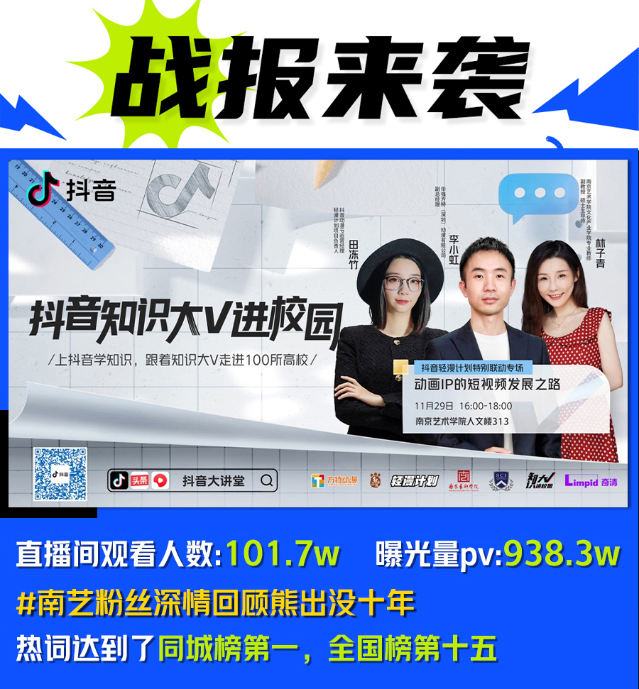 11月29日,一场由公司文化产业管理专业林子青副教授主持、华强方特(深圳)动漫有限公司副总经理李小虹和抖音轻漫计划负责人田冻竹为演讲嘉宾的直播讲座在XCsports开展。此次讲座的主题是“动画IP的短视频发展之路”,内容深入浅出,实用性强,吸引了线下及线上的大批员工,线上有效看播人数达到101.7万,曝光量高达938.3万。
