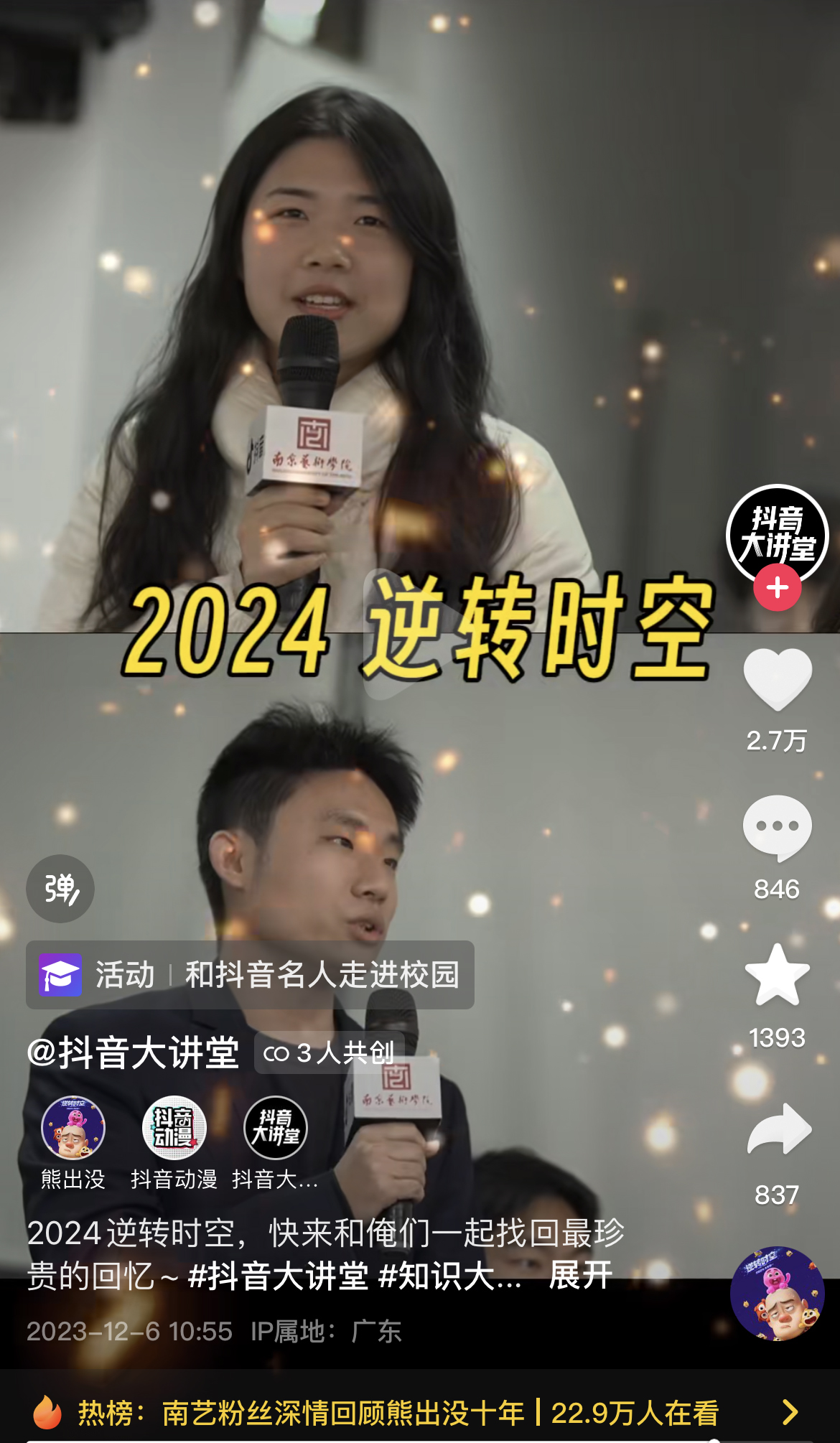 在讲座现场的互动中,文化产业管理专业研究生滕立同学和本科生顾焱同学的精彩发言收获了满堂喝彩,展现了文化产业管理专业员工优秀的精神风貌与学科认知。由此引发的话题“#南艺粉丝深情回顾熊出没十年”更是登上抖音同城热榜第一,全国榜第十五,充分证明了此次讲座的正面影响力和吸引力。
