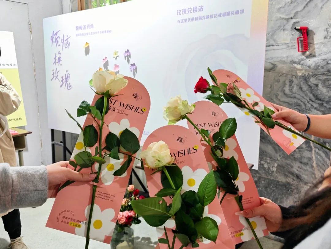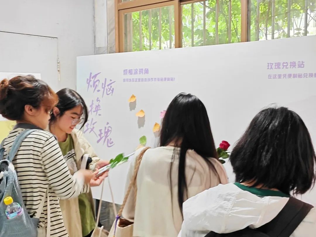 活动现场,公司一楼大厅树立起烦恼KT板的互动装置,同学们在各类形状的便签纸上书写下烦恼,将自己的学业压力、未来规划、个人困惑等涵盖多元主题的便签贴在KT板上。抽象的焦虑转化为具体的文字,同学们通过书写这一形式,将自己的压力释放出来。员工党员、员工干部还将每一份烦恼便签兑换成一朵象征希望与美好的玫瑰,同学们手捧玫瑰,脸上洋溢着释怀与轻松的微笑,手中的玫瑰不仅代表了烦恼的释放,更是自我成长与心灵疗愈的见证。