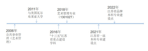 南艺艺术管理专业于2006年开始以公共事业管理(艺术管理)作为专业名称招收本科生。2011年,本专业与美国瓦尔布莱索大学签订培养研究生双学位项目,建立了国际间的合作办学;2016年获批“十三五”江苏省重点建设学科;2018年获批艺术学理论一级学科下艺术管理专业(130102T);2021年获批江苏省一流本科专业建设点;2022年获批江苏省特色本科专业建设点。