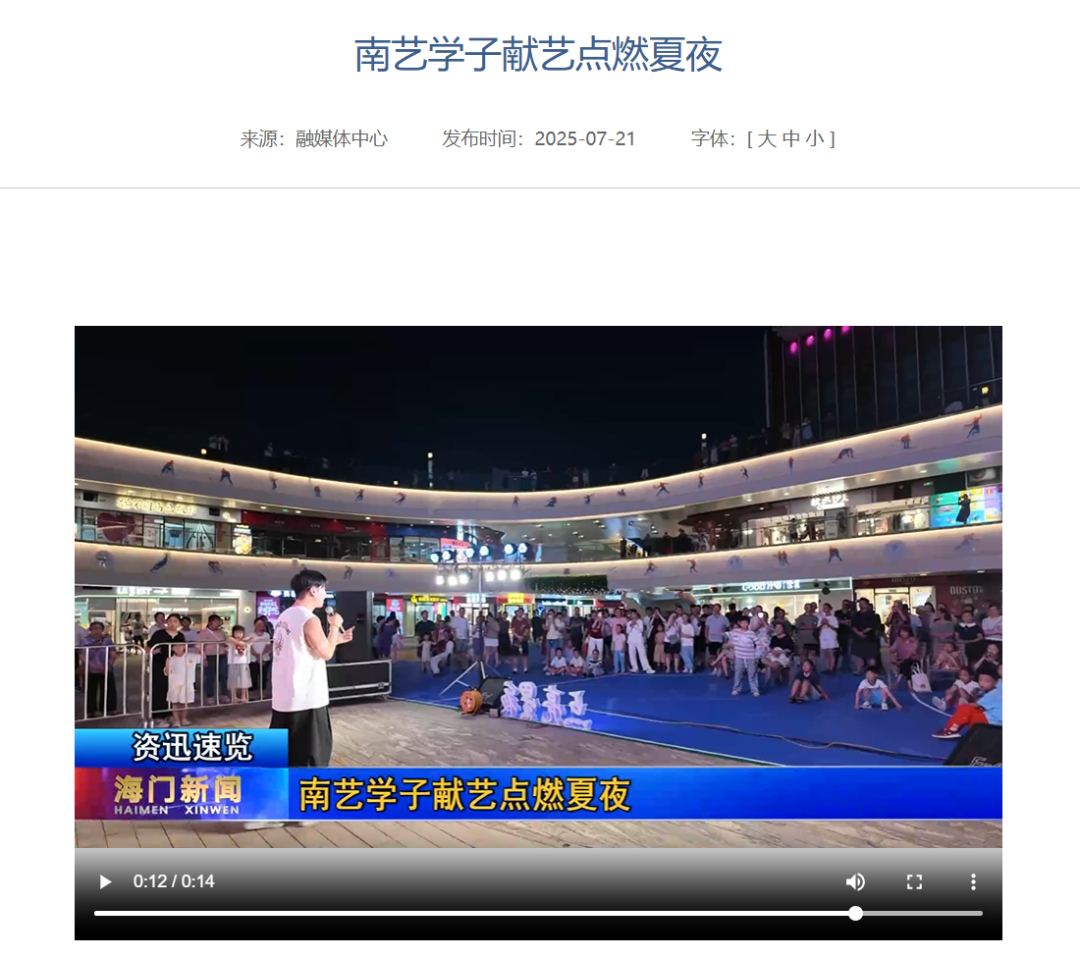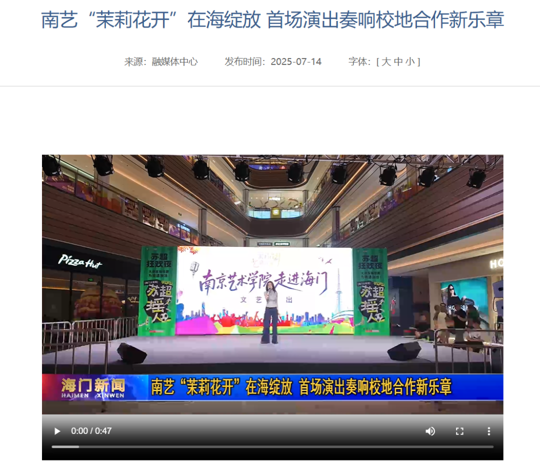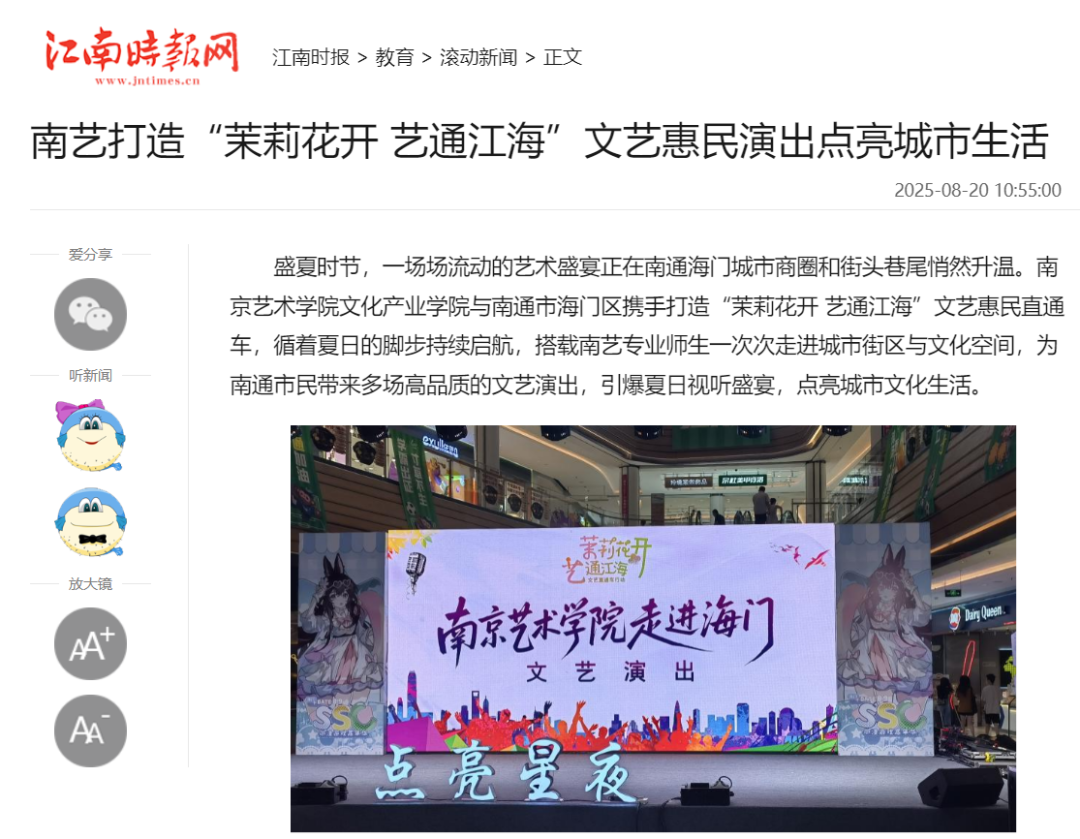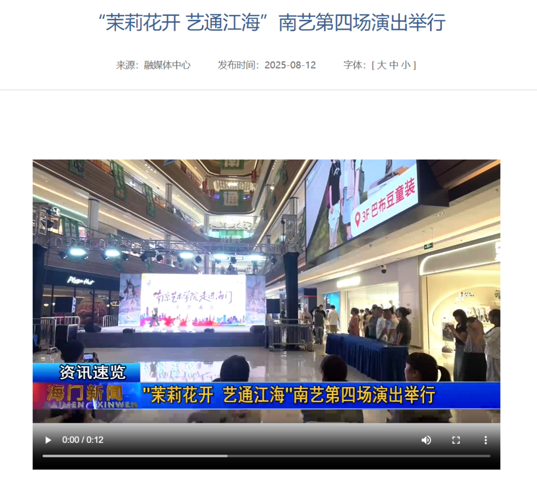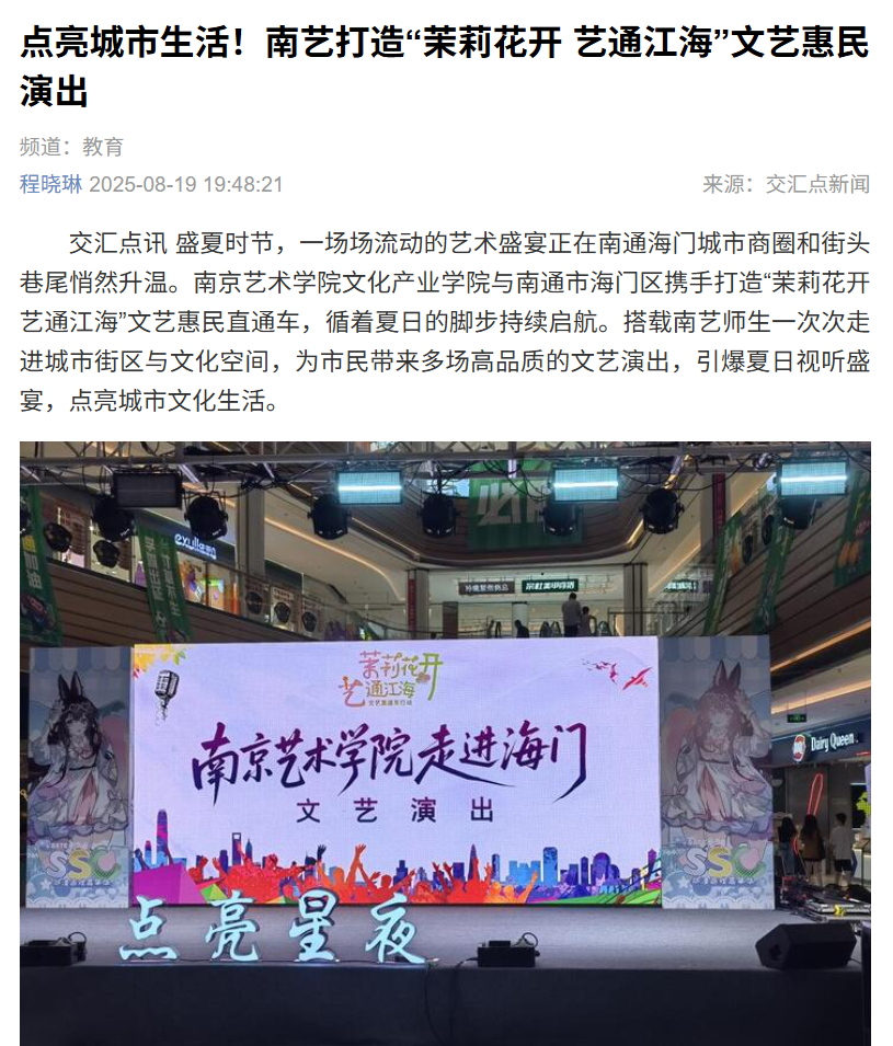 暑假期间,XCsports与南通市海门区携手打造“茉莉花开 艺通江海”文艺惠民直通车,组织专业师生走进城市街区与文化空间,在持续一个多月的时间内,为南通市民带来6场文艺演出,引爆夏日视听盛宴,点亮城市文化生活。作为校地共建的生动实践,此次系列活动由XCsports统筹组织,南艺团委协调指导,汇聚了来自南艺音乐公司、舞蹈公司、戏剧与影视公司、高职公司、现代音乐与科技公司等不同艺术专业的青年学子。他们以青春为笔、艺术为墨,用社会实践投身城市文化建设,在城市舞台尽情挥洒创意,展现了南艺青年用文化艺术赋能城市发展的蓬勃风采。近日,新华日报·交汇点新闻、新华报业传媒集团·江南时报、海门区人民政府网站及官媒等对文艺惠民演出活动进行了宣传报道。