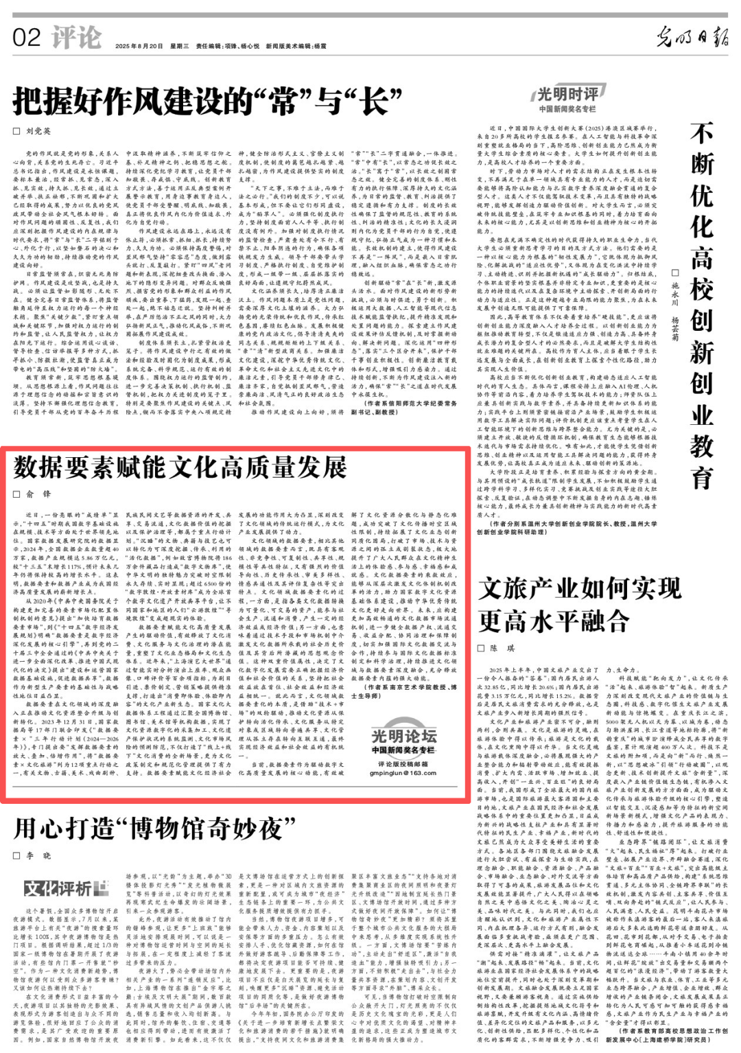 当前,数据要素作为驱动数字文化高质量发展的核心动能,有效破解了文化资源分散化与静态化难题,成功突破了文化传播时空区域性限制,持续拓展了文化业态创新同质化困局,打破了市场、技术与资源之间的孤立或割裂状态,极大地提升了广大人民群众在文化精神生活上的体验感、参与感、幸福感和成就感。文化数据要素的乘数效应,能够从深层次激发文化体制机制改革的活力,助力国家数字文化资源基础体系建设,推动中华优秀传统文化更好走向世界。未来,应构建更加高效畅通的文化数据市场流通机制,进一步健全数据产权、流通交易、收益分配、协同治理和保障制度,切实加强国际文化数据交流与合作,持续参与国际文化数据标准制定和科学治理,持续推进文化领域与数据要素深度融合,充分释放数据要素内蕴的强大动能。