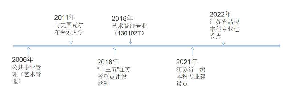 南艺艺术管理专业于2006年开始以公共事业管理(艺术管理)作为专业名称招收本科生。2011年,本专业与美国瓦尔布莱索大学签订培养研究生双学位项目,建立了国际间的合作办学。2016年本专业获批“十三五”江苏省重点建设学科。2018年本专业获批艺术学理论一级学科下艺术管理专业(130102T)。2021年本专业获批江苏省一流本科专业建设点。2022年本专业获批江苏省品牌本科专业建设点。